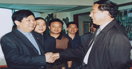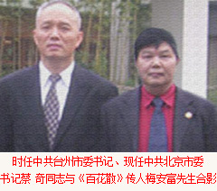 全國政協(xié)副主席、中共中央委員、中國殘聯(lián)主席鄧樸方先生與鄭州臺州商會支部書記兼秘書長、《百花散》傳人梅安富先生親切交談鄭州市腫瘤康復(fù)協(xié)會名譽(yù)會長。2005年5月,作為臺州古代中醫(yī)秘方梅氏《百花散》